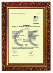 竊測(cè)試試用超銳夾膠UV-H型制成夾層玻璃的抗擊性能,用機(jī)械斧頭均勻砍擊夾層玻璃次數(shù)分別為31-50次和51-70次。兩種標(biāo)準(zhǔn)所能達(dá)到防盜竊和破門安全性能的不同級(jí)別的防護(hù)標(biāo)準(zhǔn)。(中國GB9962-1999國家標(biāo)準(zhǔn)沒有歐洲標(biāo)準(zhǔn)機(jī)械斧頭抗防盜的打擊標(biāo)準(zhǔn))。