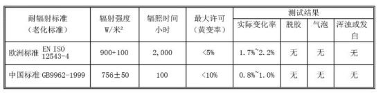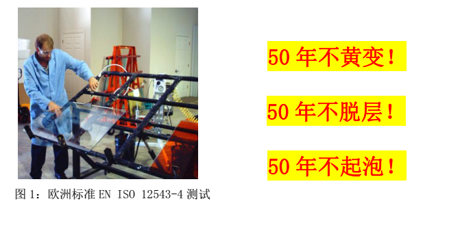 歐洲標(biāo)準(zhǔn)EN 12543-4模擬50年室外老化性、耐候性測(cè)試。用超銳夾膠制成的夾層玻璃通過(guò)高溫、耐濕、老化(輻射),測(cè)試夾層是否脫層、變色、產(chǎn)生氣泡等問(wèn)題。